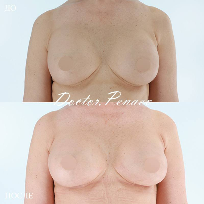 Пациентка доктора А.А. Пенаева, 55 лет. Беспокоит деформация молочных желез из-за капсулярной контрактуры третьей степени, которая развилась после ранее проведенного в другом лечебном учреждении протезирования молочных желез (несколько лет назад). Выполнено удаление старых имплантов, капсулоэктомия и репротезирование имплантами SILIMED 270 ml анатомической формы высокого профиля. Результат через год после операции.