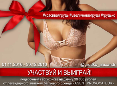 С 1 ноября по 30 декабря 2016 года пластический хирург Александр Грудько даёт своим пациентам уникальную возможность принять участие в конкурсе, чтобы выиграть подарочный сертификат от элитного бельевого бренда «AGENT PROVOCATEUR».