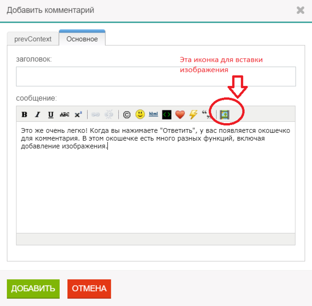 Когда вы нажимаете «Ответить», у вас появляется окошечко для комментария. В этом окошечке есть много разных функций, включая добавление изображения.