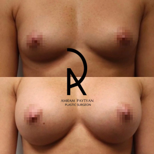 Пациентка доктора Амрама Пайтяна до и после увеличивающей маммопластики. Установлены имплантаты Ментор, объем 400 мл
